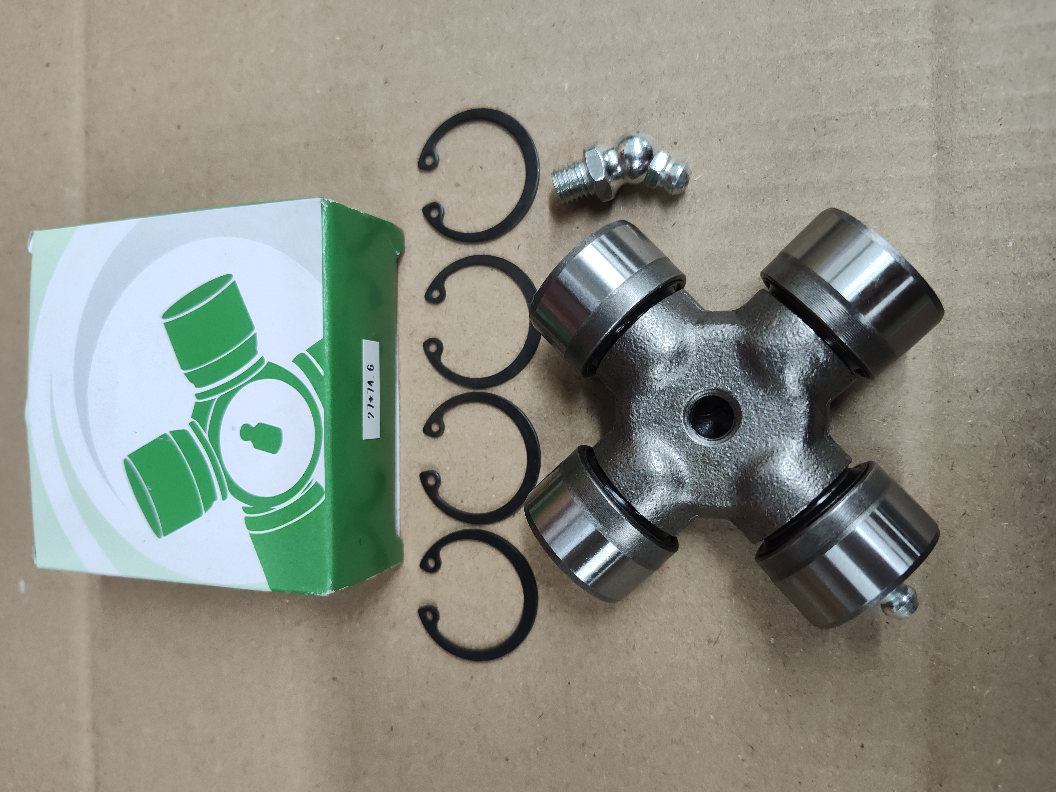 Крестовина карданного вала 27х74,6 мм. Аналог W2300, G4. Диаметр чашечки 27 мм., высота в сборе - 74,6 мм. Устанавливается в вилки карданного вала поочередно. Фиксация крестовины - спопорными кольцами с внешней стороны крестовины. Тавотницы установлены как по центру крестовины, так и с торца, на чашечке.
